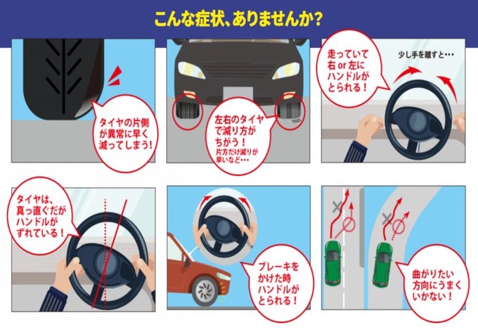 ※何もしていなくても、車体のよじれ・部品のヘタリでアライメントは狂います。