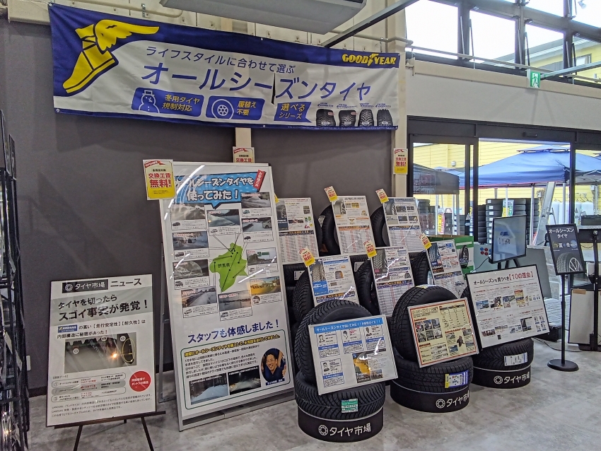 他店ではオールシーズンタイヤは一種類だけなんてこともございますがタイヤ市場では豊富なラインナップでお客様をお出迎え‼