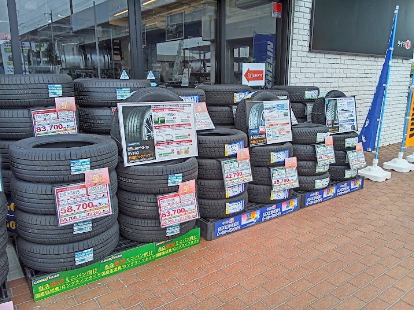入り口の展示が完成!価格・性能文句なし!幅広いサイズご用意あります。高崎市周辺にお住まいの方はタイヤ市場へ!