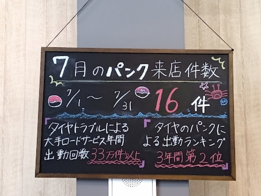 7月のパンクによるご来店は16件!タイヤ市場高崎緑町店ならいざというときに安心なメンテナンス会員(パンク保証)も完備!