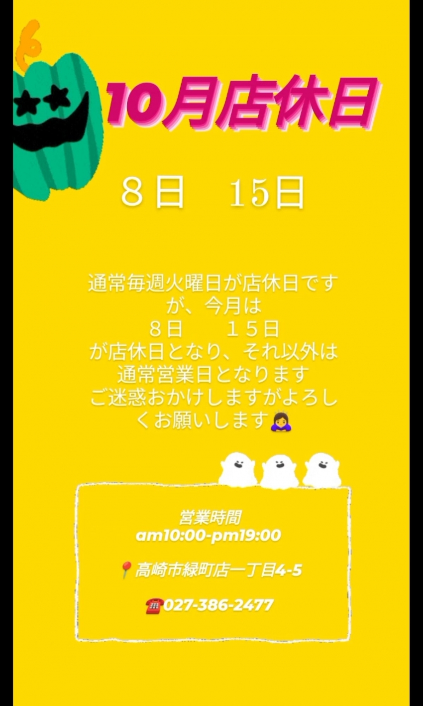10月店休日のお知らせです