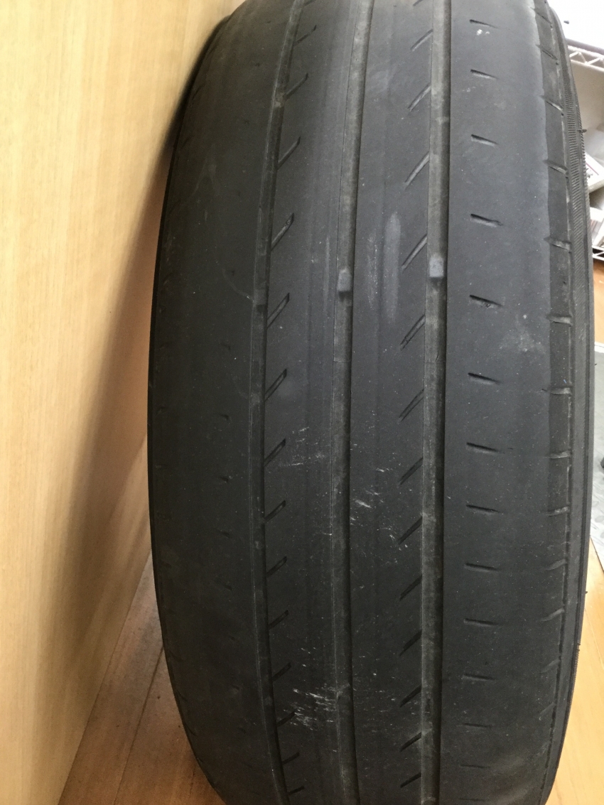 すでに夏タイヤへの交換がお済だとは思いますが、画像のように摩耗が進んでいませんか?実はこの画像、私が以前履いていたタイヤです。 中央のスリップサインまでコンマ数ミリですが溝がほぼありません。スタッドレスに交換した時は「まだいける。」と思っていたのですが、夏タイヤに交換するときに「わーっ!思って以上に減っていた!!」となりました。 雨天時にはスリップする可能性も有ります。お客様ご自身でタイヤ交換されている方は、交換時に溝の確認、ひび割れがないかどうか、パンクしていないかどうかの確認をしてから装着されることをオススメ致します。
