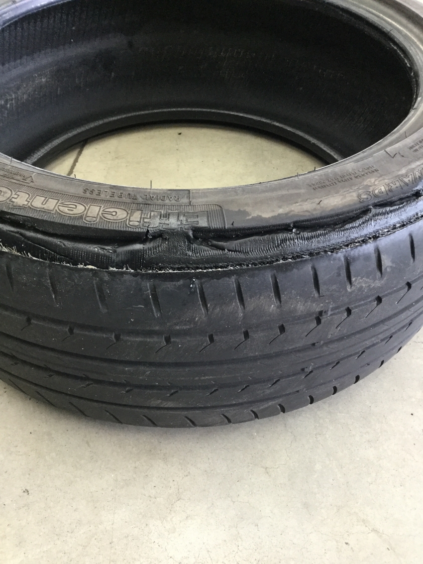 装着のタイヤはランフラットタイヤでパンクしたタイヤを見てみると画像のような状態でショルダー部に亀裂が入っており、隙間もあります。が、この状態で自走して来店されました。