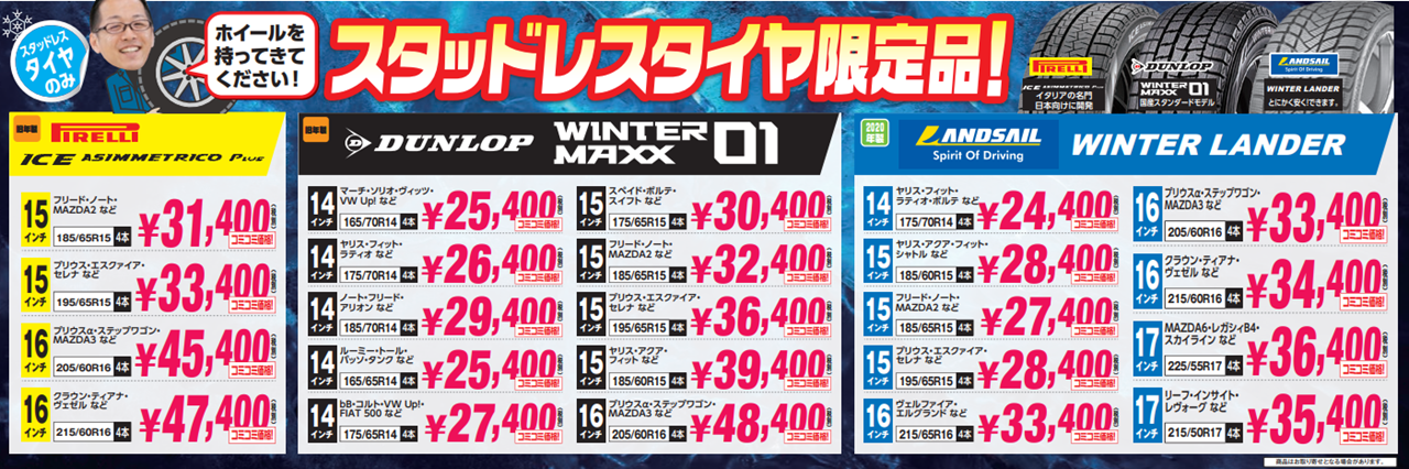 只今、タイヤ市場館林店ではスタッドレス即売大セールを開催中!!