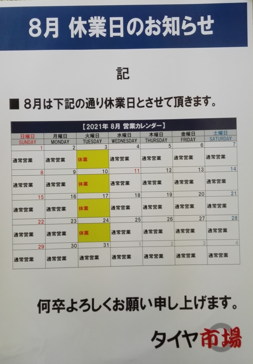 8月店休日のお知らせ♪(^^♪