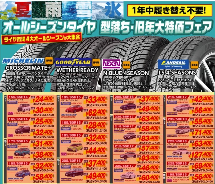 オールシーズンタイヤの旧年製造が安くなりました!