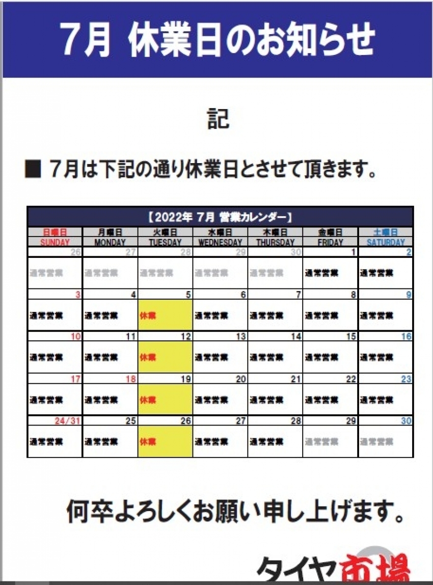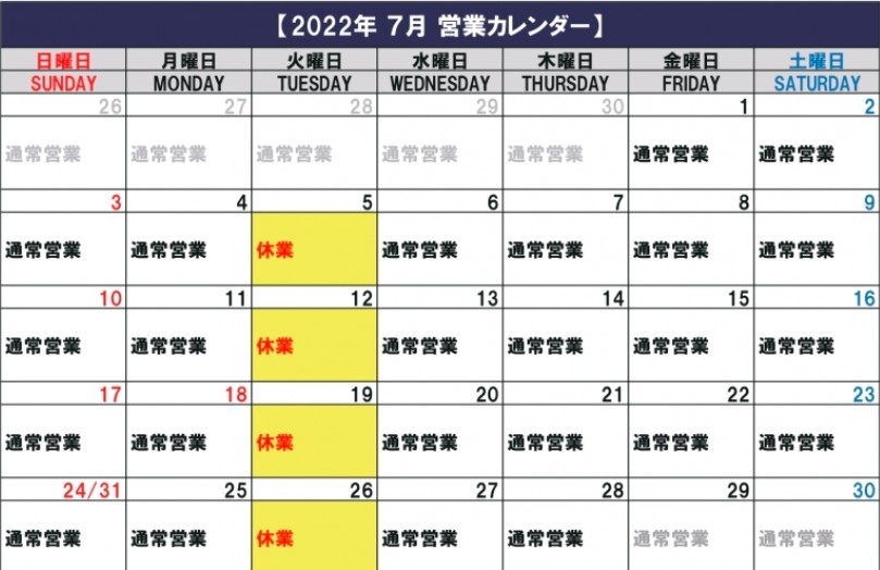 7月の営業カレンダー