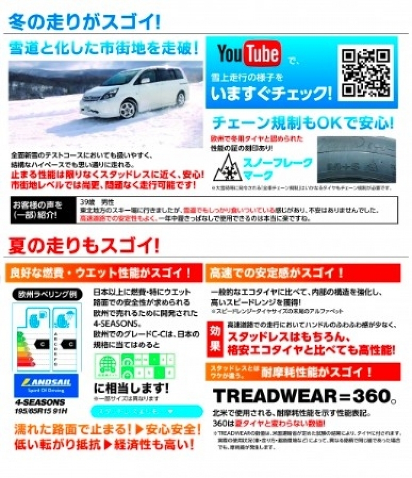 ランドセイル4シーズンズって安くて夏冬使えてお得感満載なタイヤなんです。