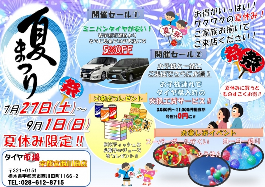 そんな暑い夏を吹き飛ばす夏祭りイベントをタイヤ市場宇都宮西川田店で開催します!!