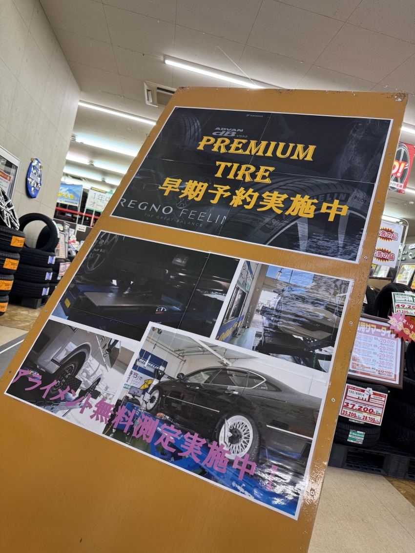 「プレミアム早期予約実施中!!!&アライメント無料測定実施中!!!」看板設置しました!!!
