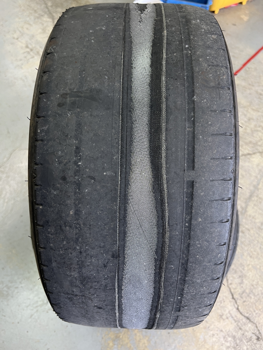 真ん中の溝だけが減り過ぎてしまい、タイヤの中のワイヤーが完全に出ています